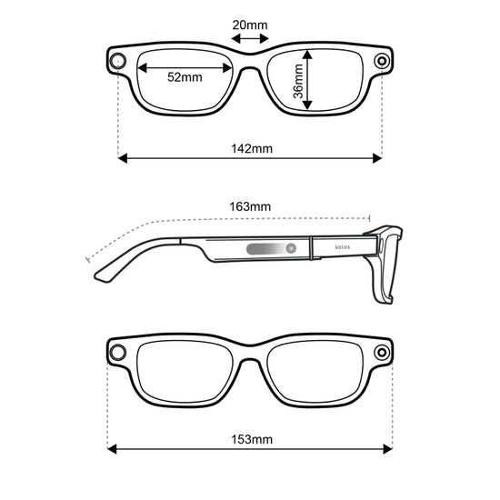 These smartglasses have slightly larger dimensions than the previous model. Each lens is 52mm wide and 36mm tall. The nose bridge is 20mm wide. The total front frame width is 142mm, and including the hinges, the full width is 153mm. The side arms remain the same at 163mm. Key differences: this model is 4mm wider at the front, the lenses are 1mm wider, the bridge is 1mm wider, and the overall full-frame width is 4mm broader. The lens height is just 1mm shorter. These changes offer a slightly roomier fit.